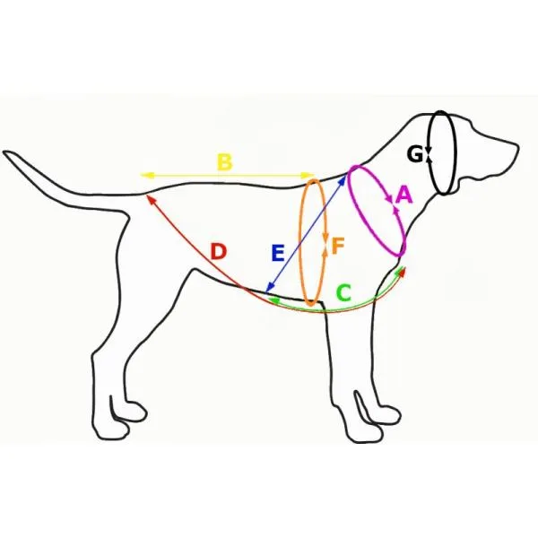 Damit wir das Geschirr gut passend nähen können, benötigen wir einen sorgfältig abgemessenen Hund. Bitte immer enganliegend und ohne Zugabe messen.
